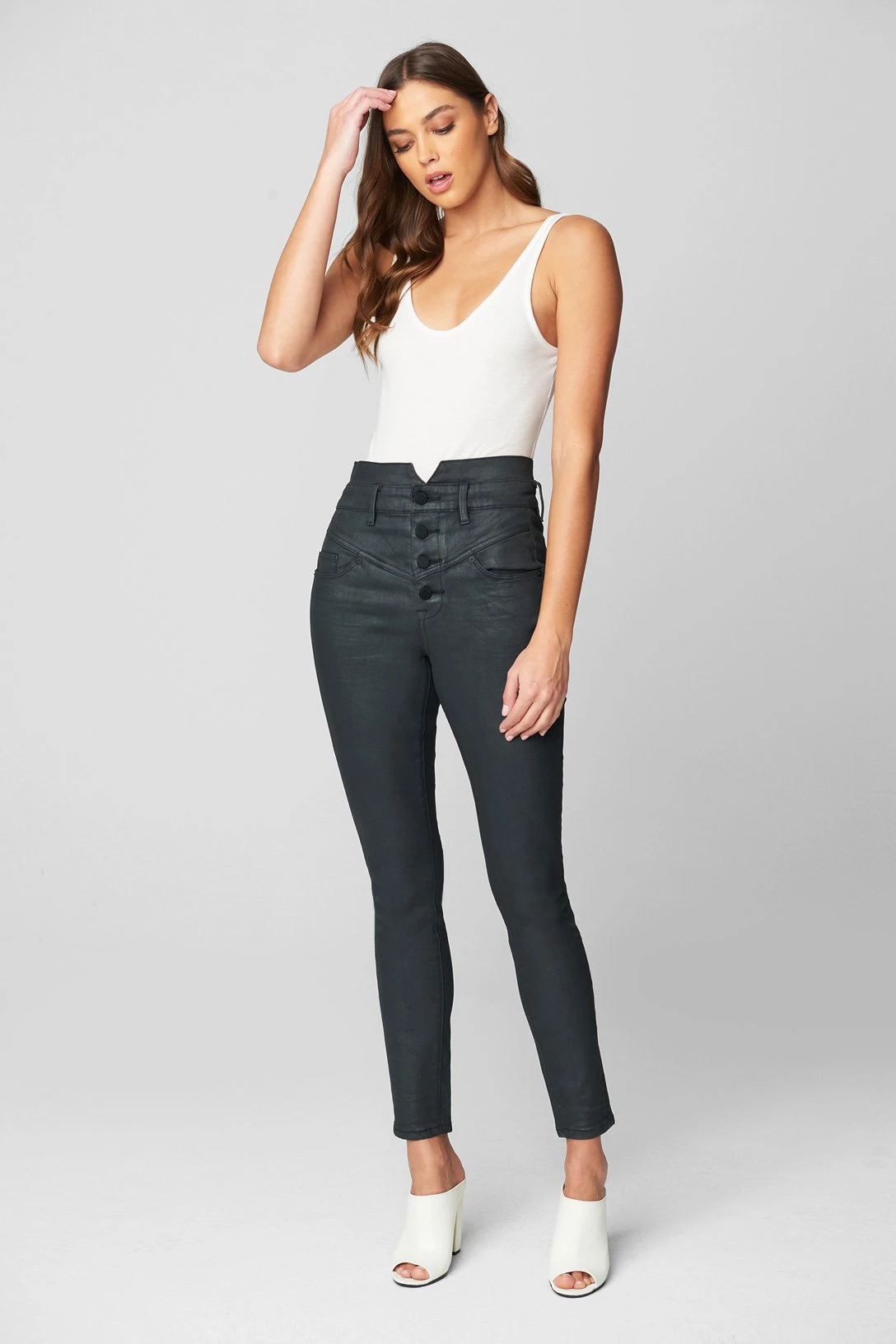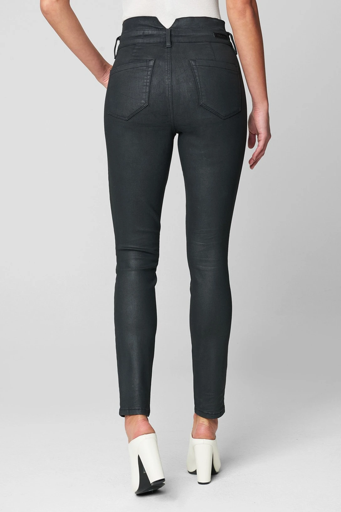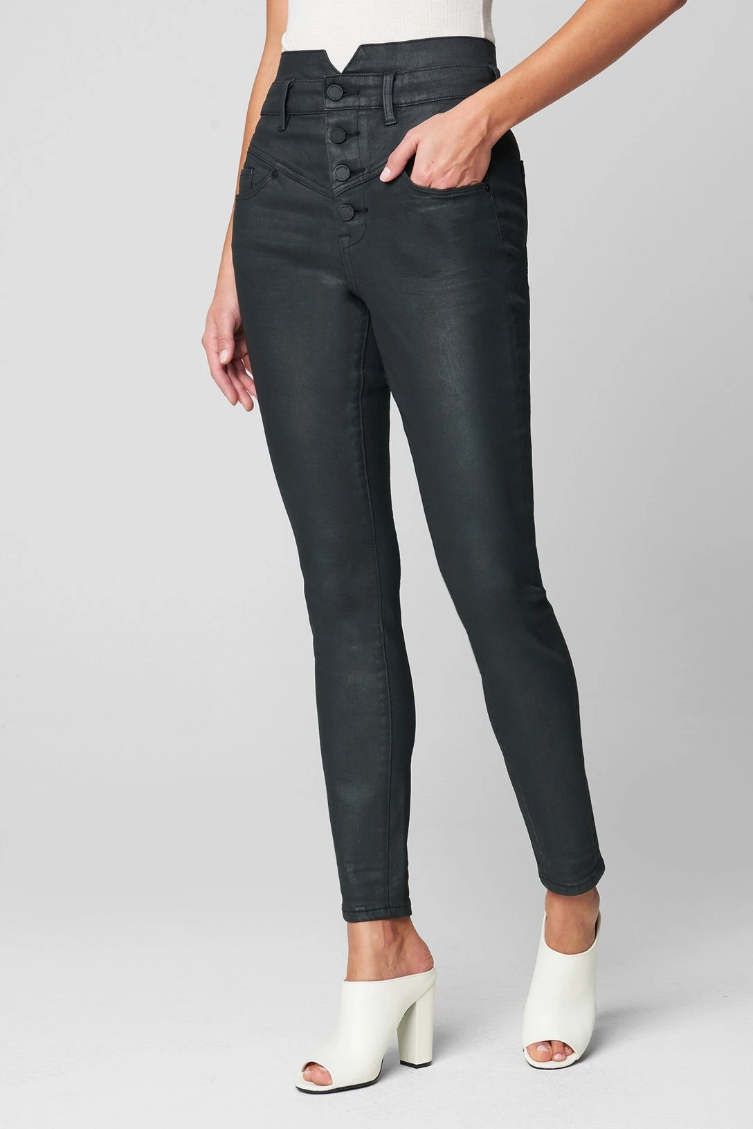 Black high rise seamed coated jean with exposed button fly[68% Cotton, 20% Polyester, 11% Viscose, 1% Spandex][WASH IN MESH BAG, TURN GARMENT INSIDE OUT, MACHINE WASH COLD WITH LIKE COLORS, DO NOT BLEACH, HANG DRY, LOW IRON ON REVERSE SIDE][Model Measurements: Height 5’8″, Bust 32”, Waist 25”, Hip 34”][Size on Model: 28”]