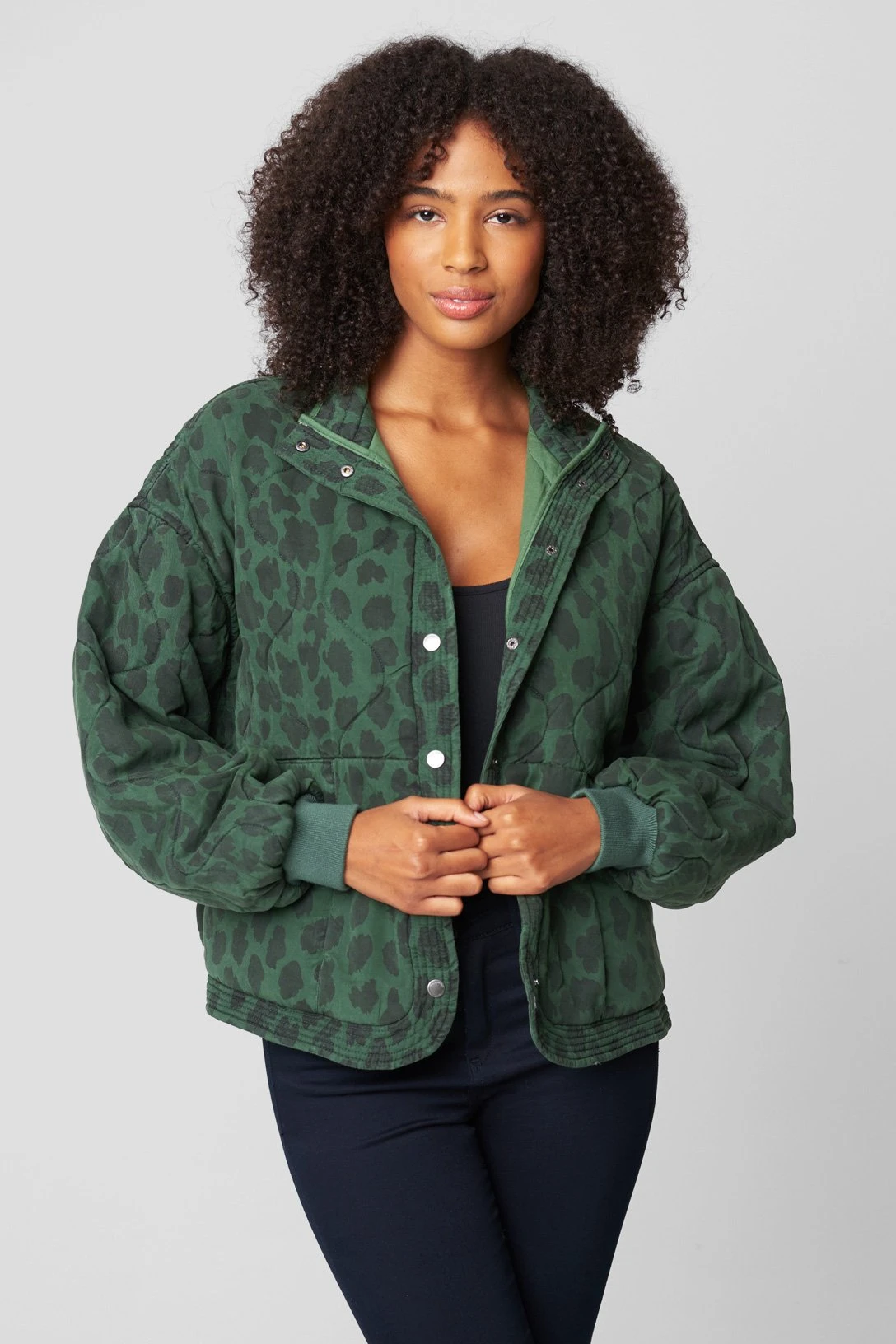 Green and black leopard printed drop shoulder quilted jacket[100% Lyocell, Filling: 100% Polyester, Lining: 100% Cotton][MACHINE WASH COLD WITH LIKE COLORS, USE GENTLE CYCLE, DO NOT BLEACH, TUMBLE DRY LOW, REMOVE PROMPTLY, LOW IRON IF NEEDED][Model Measurements: Height 5’10”, Bust 32″, Waist 25″, Hips 35 1/2″][Size on Model: Small]