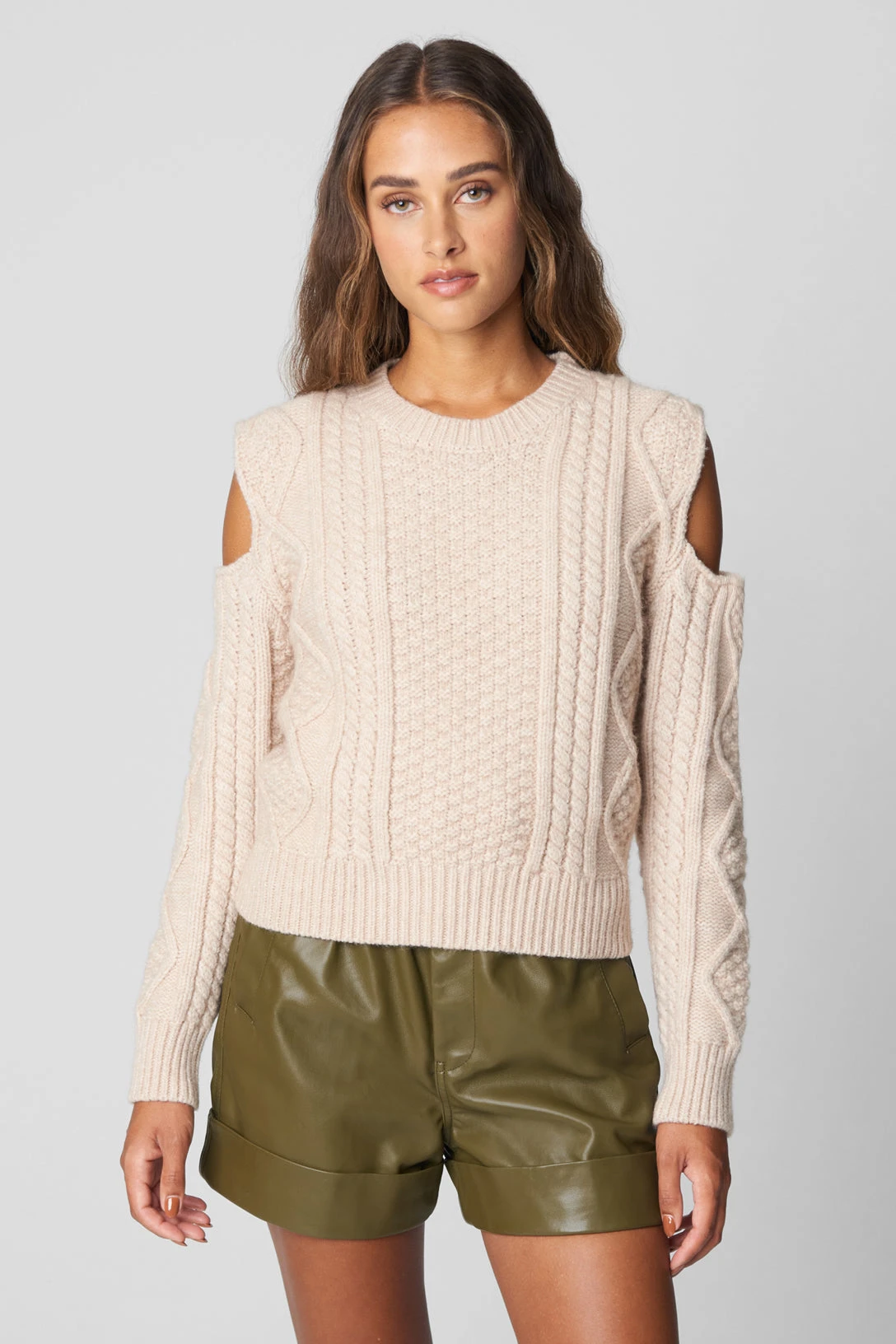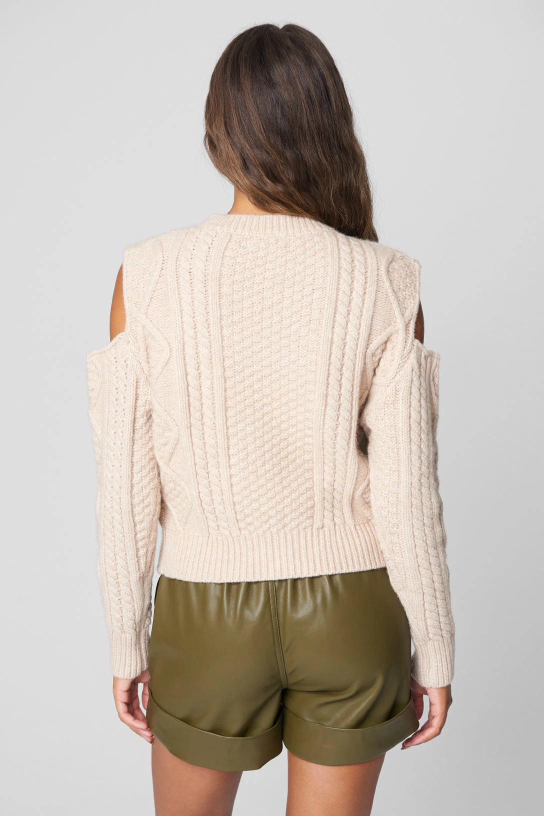 Cold Shoulder Cable Detail Sweater[Shell: 52% Acrylic, 28% Nylon, 20% Polybutylene Terephthalate][Hand Wash Cold Separately, Do Not Bleach, Lay Flat To Dry, Low Iron If Needed ][Model Measurements: Height 5’10, Chest 34″, Waist 24″, Hips 35″][Size on Model: Small]
