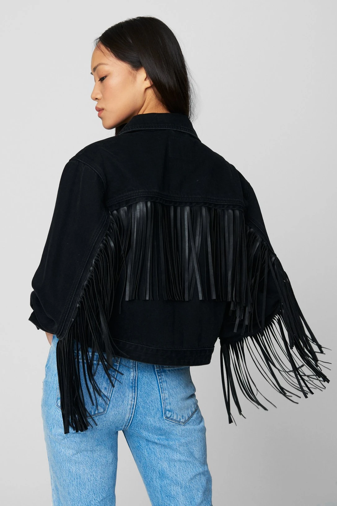Black denim cropped faux suede fringe jacket[Body: 82% Cotton, 18% Polyester; Trim: 55% Cotton, 45% Polyurethane][MACHINE WASH COLD WITH LIKE COLORS, USE GENTLE CYCLE, DO NOT BLEACH, HANG TO DRY, IRON LOW ON REVERSE SIDE, DO NOT IRON ON TRIM][Model Measurements: Height 5’9″, Waist 24”, Hip 34 1/2”][Size on Model: Small]