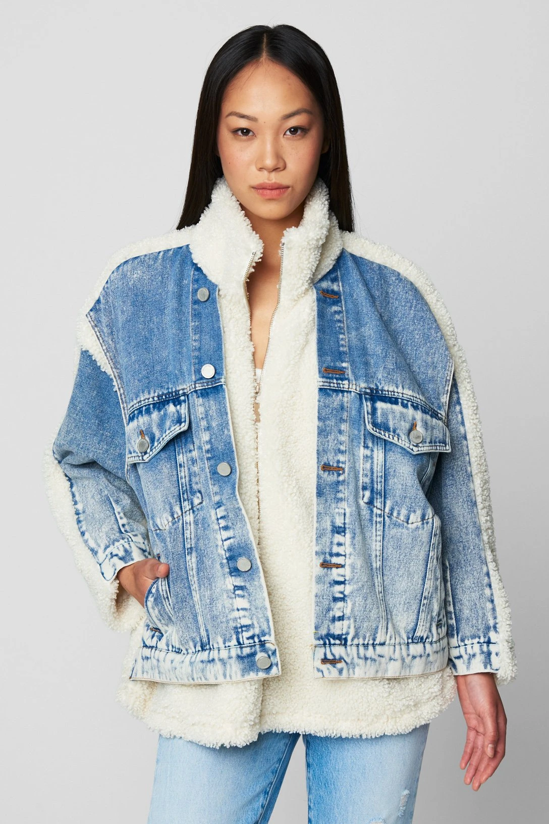 Off-white sherpa and denim trucker jacket[Shell: Faux Fur 100% Polyester; Shell 2: 65% Cotton, 35% Polyester, Lining: 100% Polyester][DRY CLEAN RECOMMENDED CLEANING BY A SPECIALIST][Model Measurements: Height 5’9″, Waist 24”, Hip 34 1/2”][Size on Model: Small]