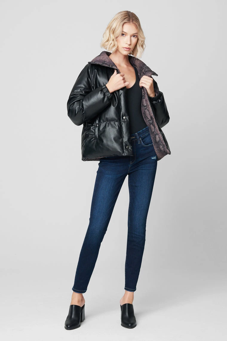 Ultra cool girl black vegan leather puffer jacket reversible to grey snake print