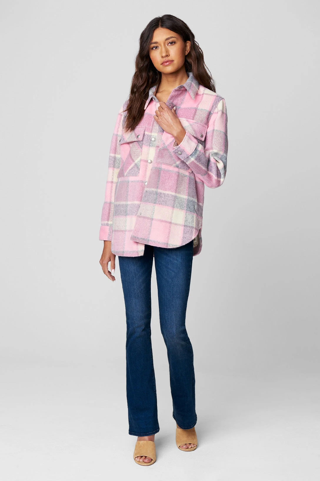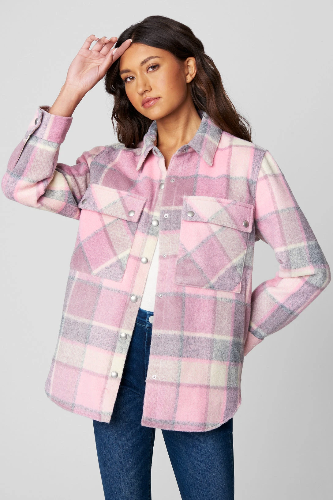 Oversized Flannel Shirt Jacket[97% Polyester, 3% Spandex][Dry Clean Only][Model Measurements: Height 5’9, Waist 27′][Size on Model: Small]
