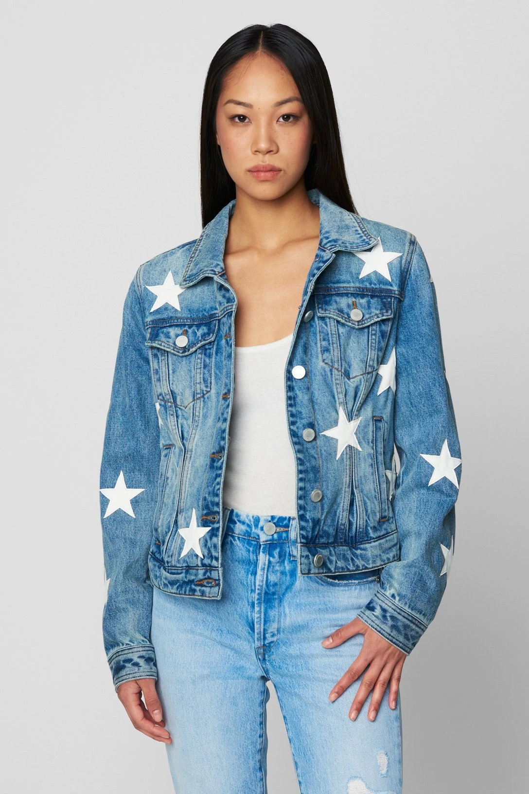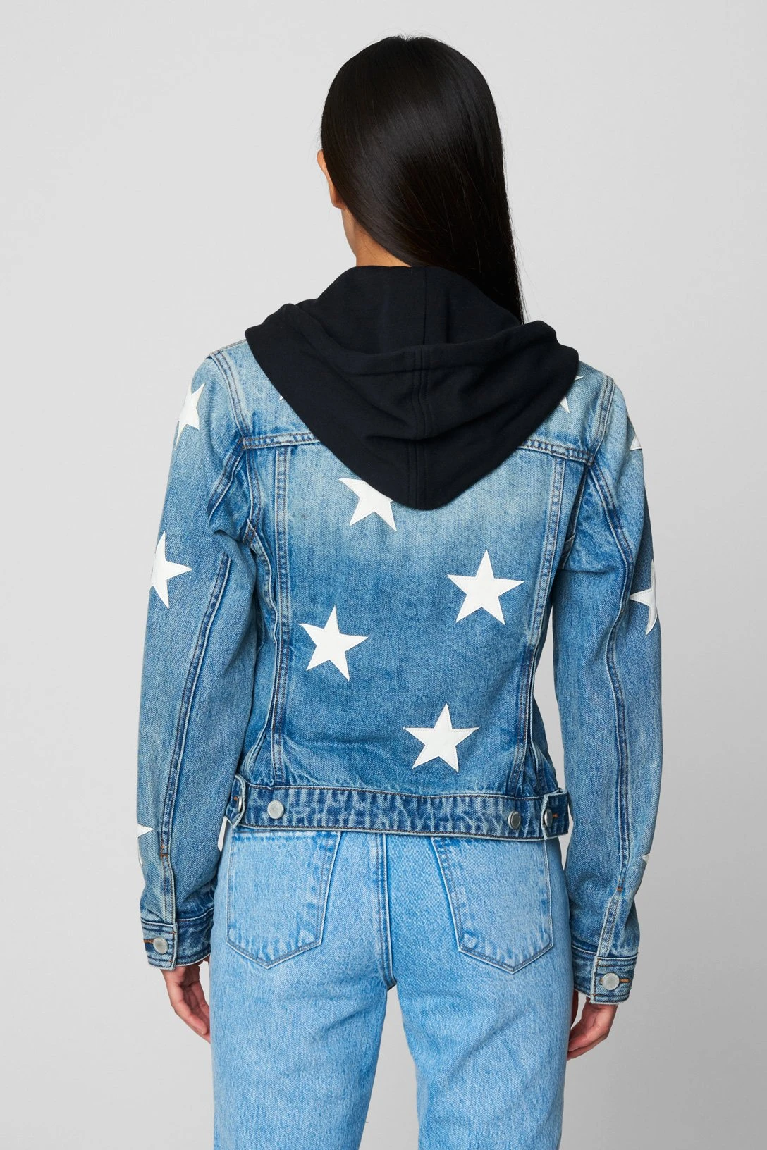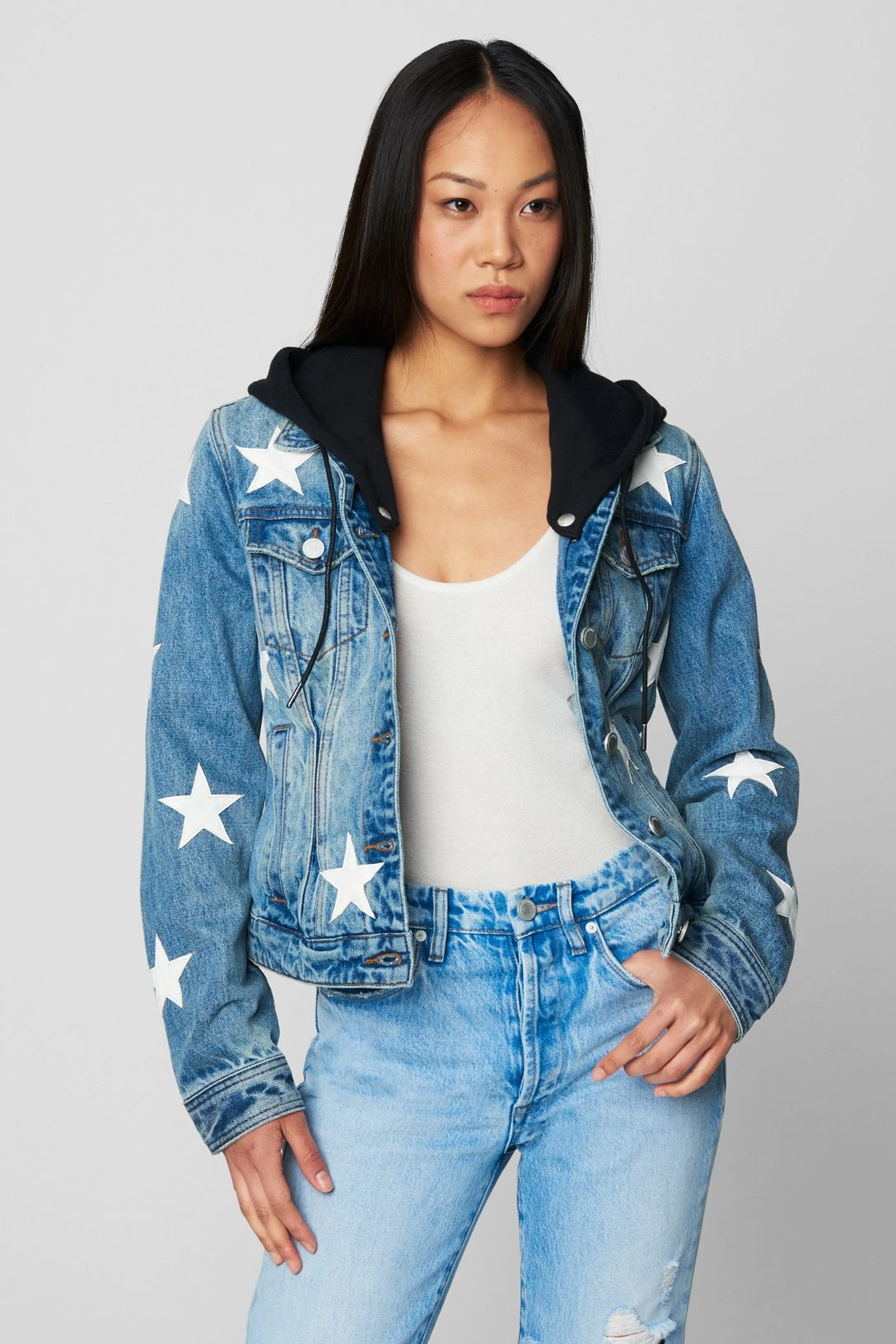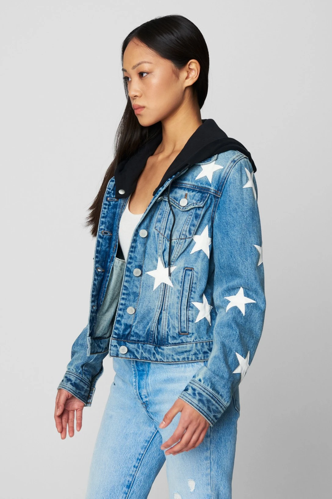 Blue, white & black star patch denim jacket with jersey hood[100% COTTON, HOOD: 100% COTTON][MACHINE WASH COLD WITH LIKE COLORS, USE GENTLE CYCLE, DO NOT BLEACH, HANG DRY, IRON LOW ON REVERSE SIDE, DO NOT IRON ON DECORATION][Model Measurements: Height 5’10”, Bust 32″, Waist 24 1/2″, Hips 35″][Size on Model: Small]
