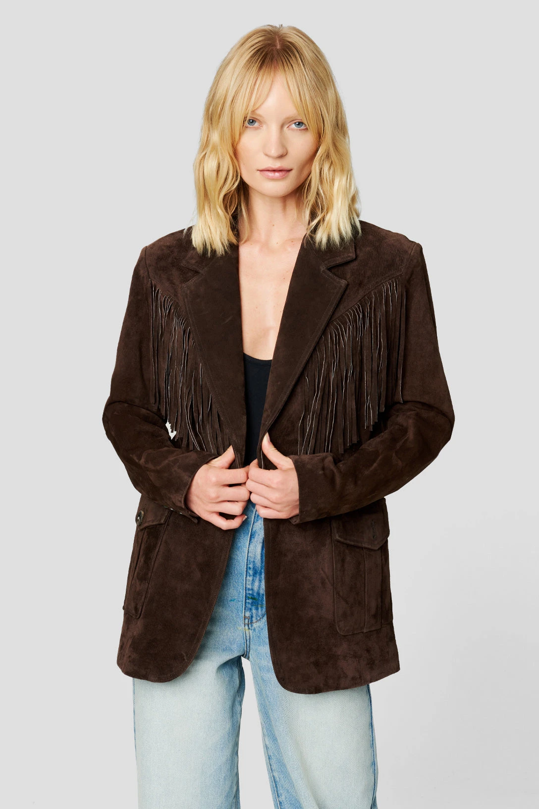 Oversized Blazer with Fringes[100% Leather][Dry Clean Only][Model Measurements: Height 5’8 | 173 cm, Bust 30B | 76 cm, Waist 24″ | 61 cm, Hips 34′ | 86 cm][Size on Model: Small”]