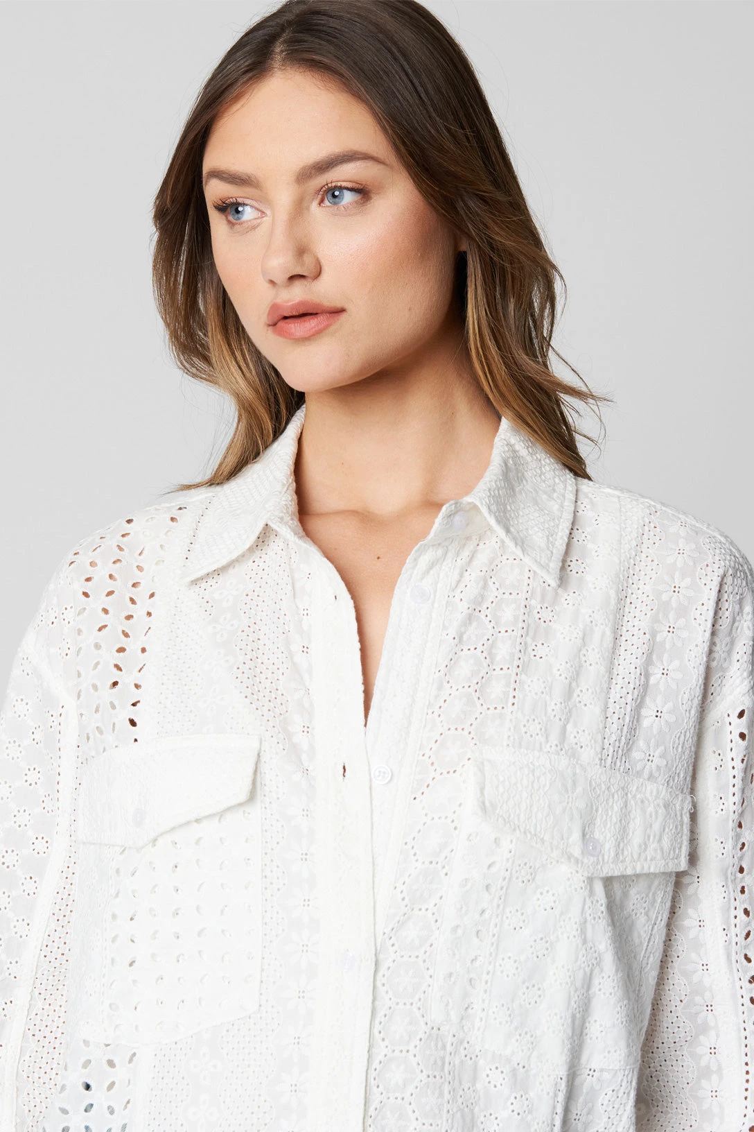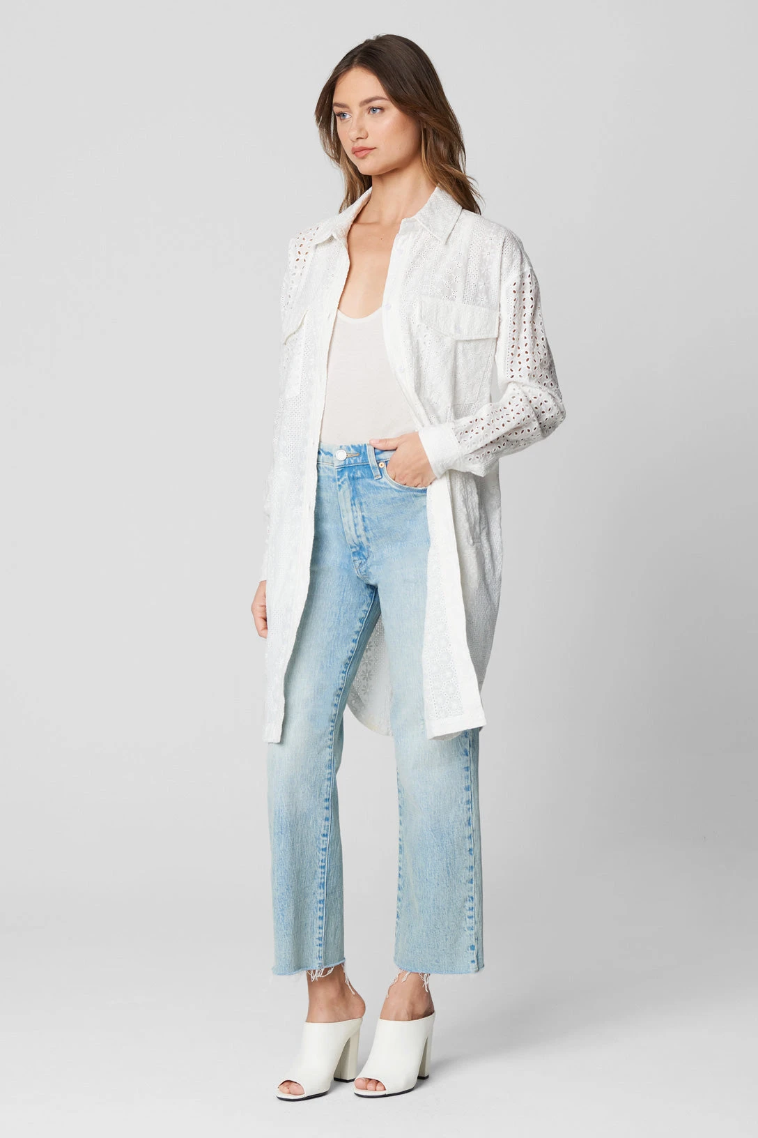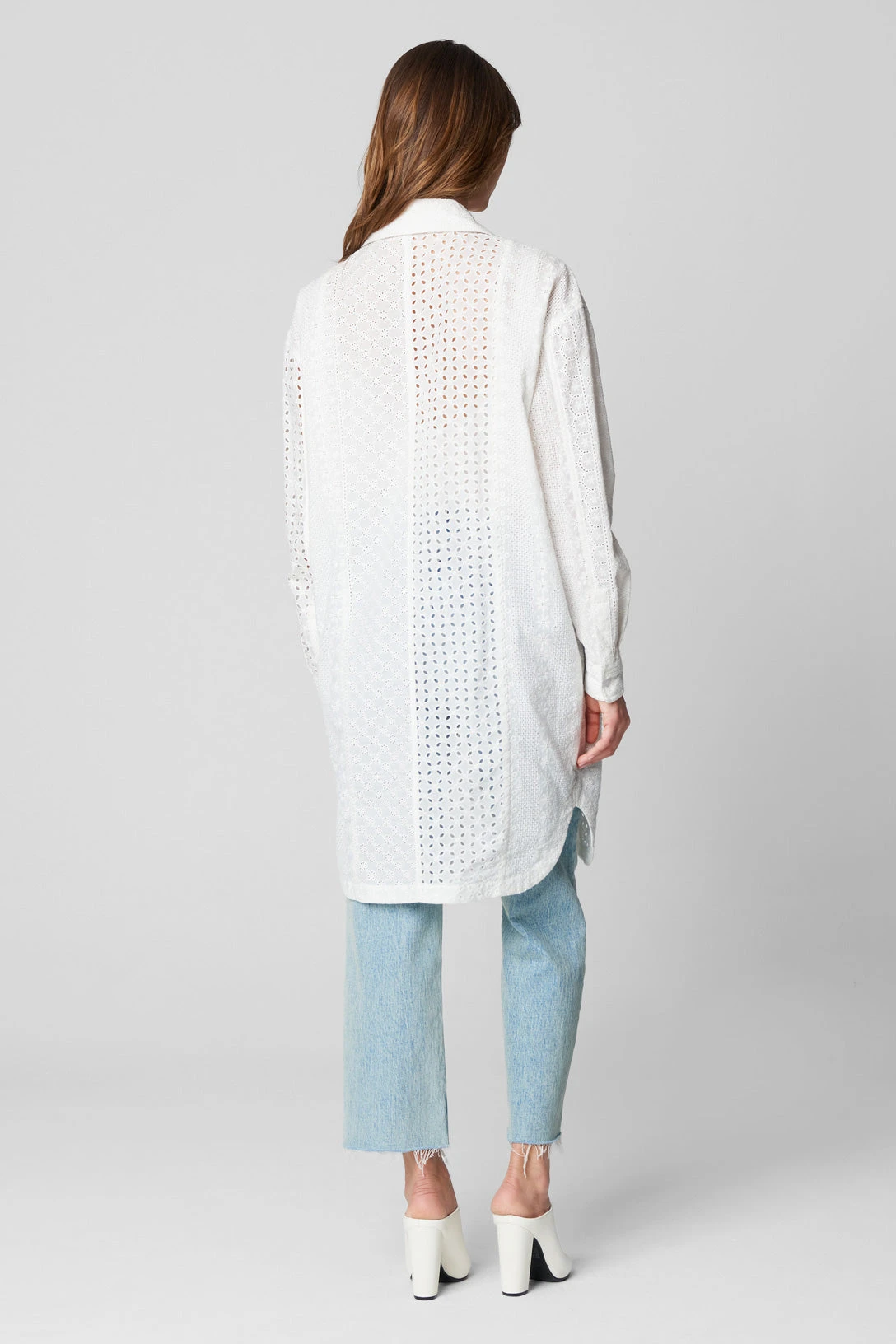 Eyelet Embroidered Long Shacket[100% Cotton][Turn Garment Inside Out Machine Wash Cold With Like Colors Use Gentle Cycle Do Not Bleach Tumble Dry Low Remove Promptly Iron Low If Needed][Model Measurements: Height 5’9″, Waist 24″][Size on Model: Small]