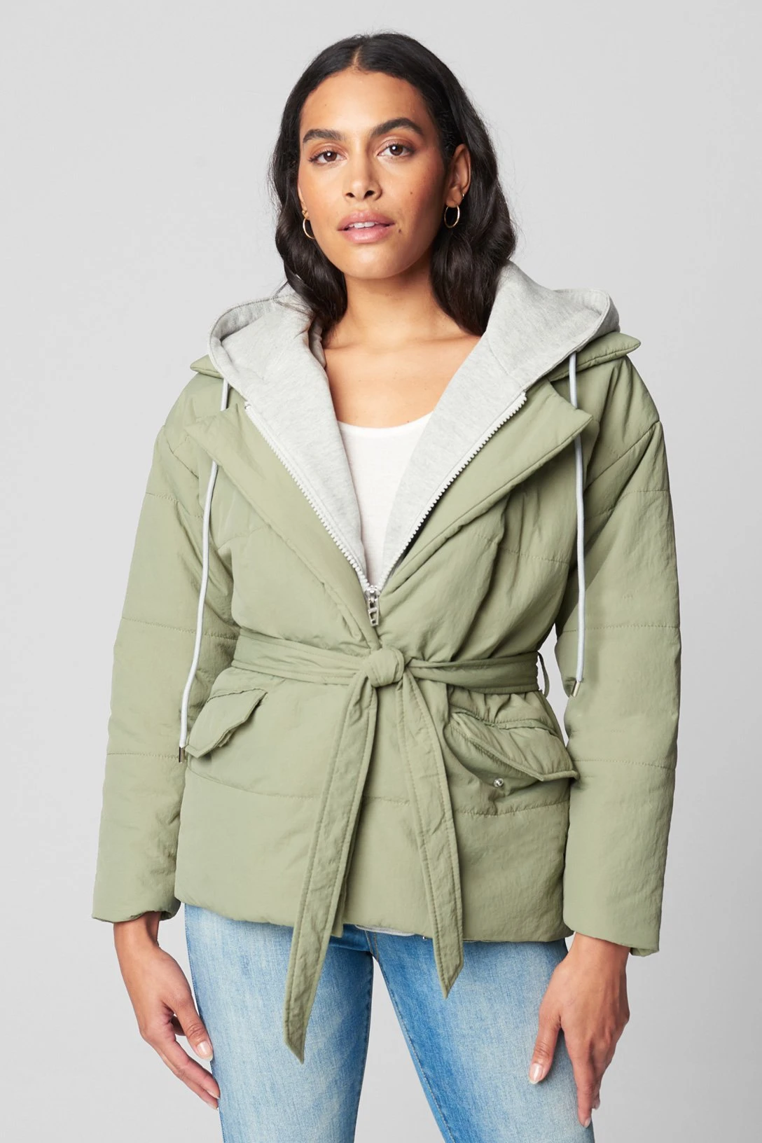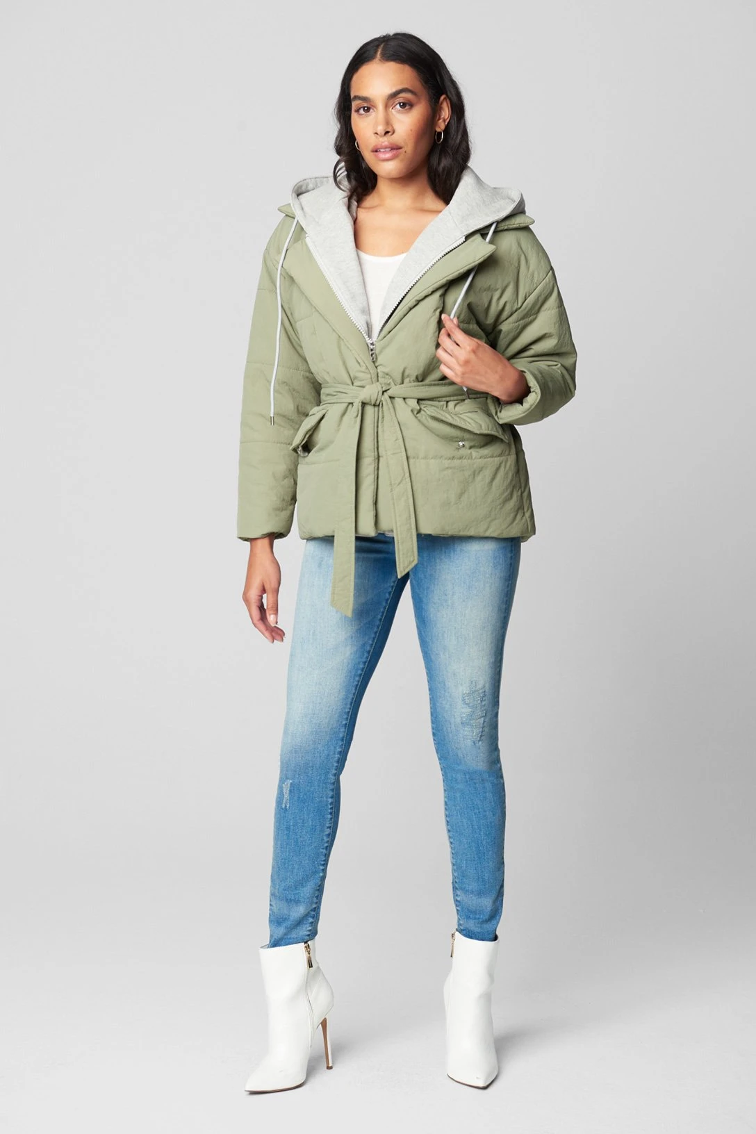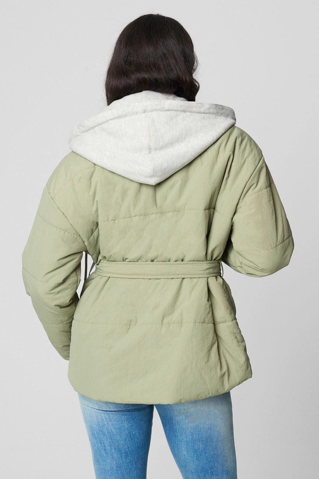 Green self-belt jacket with grey removable hood[Shell: 100% Nylon; Hood: 100% Cotton; Lining: 100% Polyester][TURN GARMENT INSIDE OUT, MACHINE WASH COLD WITH LIKE COLORS, USE GENTLE CYCLE, DO NOT BLEACH, HANG TO DRY, DO NOT IRON][Model Measurements: Height 5’8″, Bust 32”, Waist 25”, Hip 34”][Size on Model: Small]