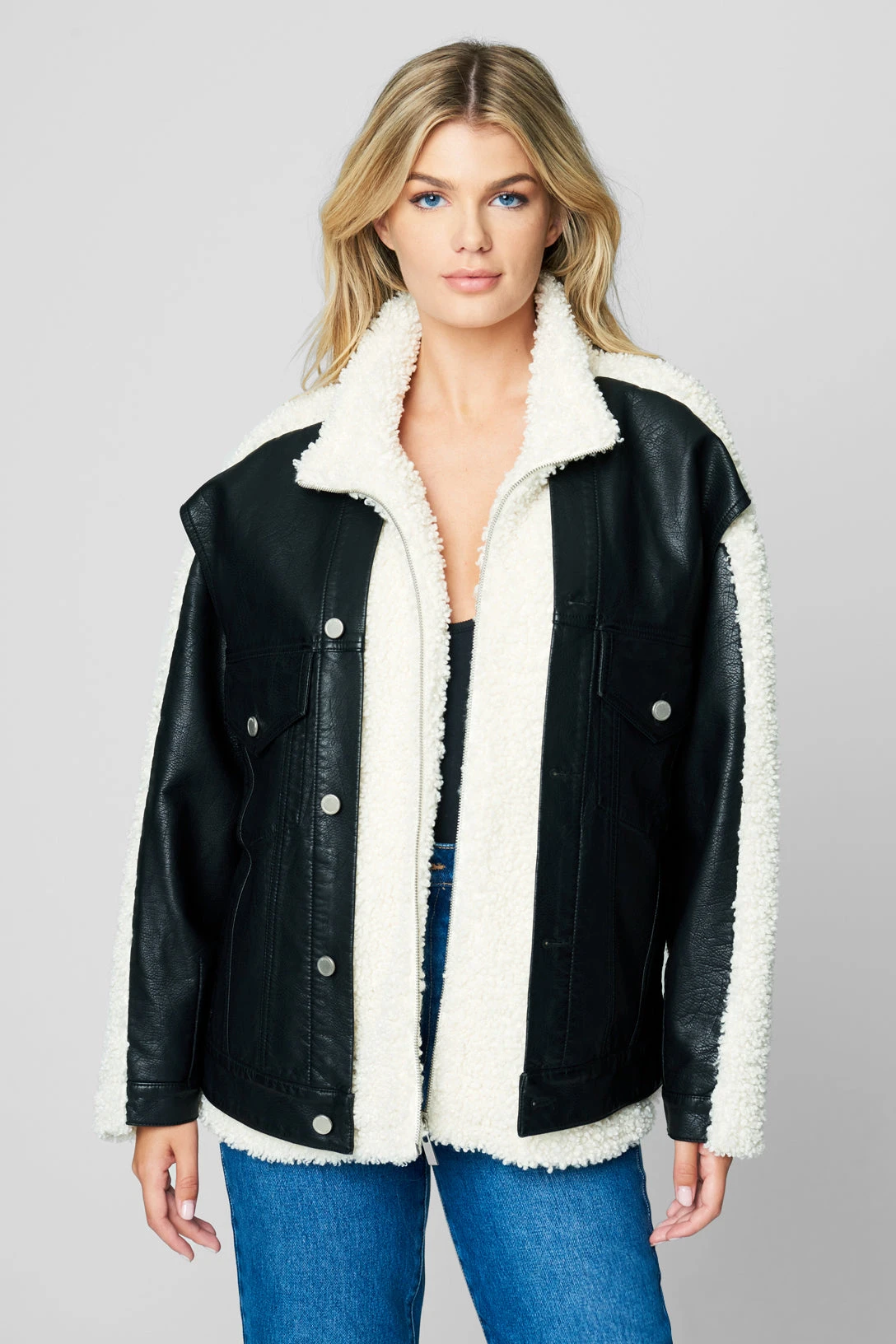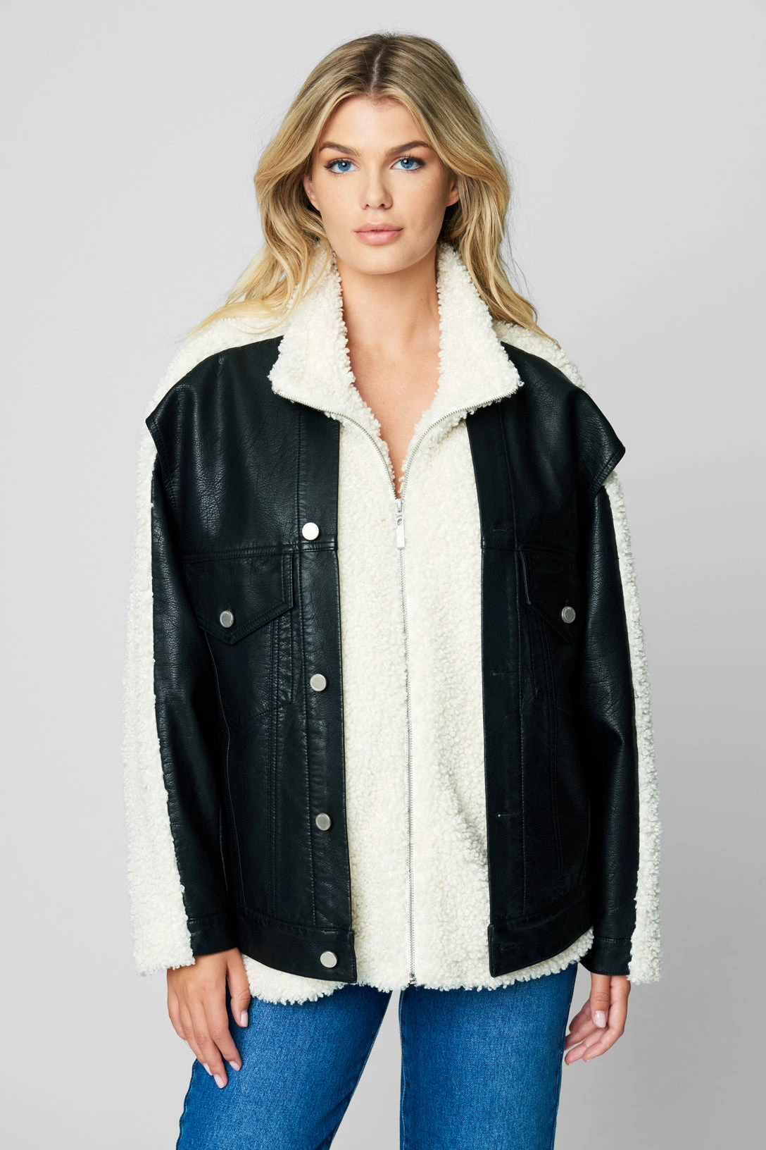 Sherpa & Vegan Leather Trucker Jacket[“Shell Faux Fur: 100% Polyester, Shell 2: 100% Polyester, Backing: 90% Polyester 5% Viscose 5% Cotton Lining: 100% Polyester”][“Turn Garment Inside Out Machine Wash Cold With Like Colors Use Gentle Cycle Do Not Bleach Hang To Dry Do Not Iron “][Model Measurements: Height 5’10, Bust 34B, Waist 24.5″, Hips 35.5′][Size on Model: Small]