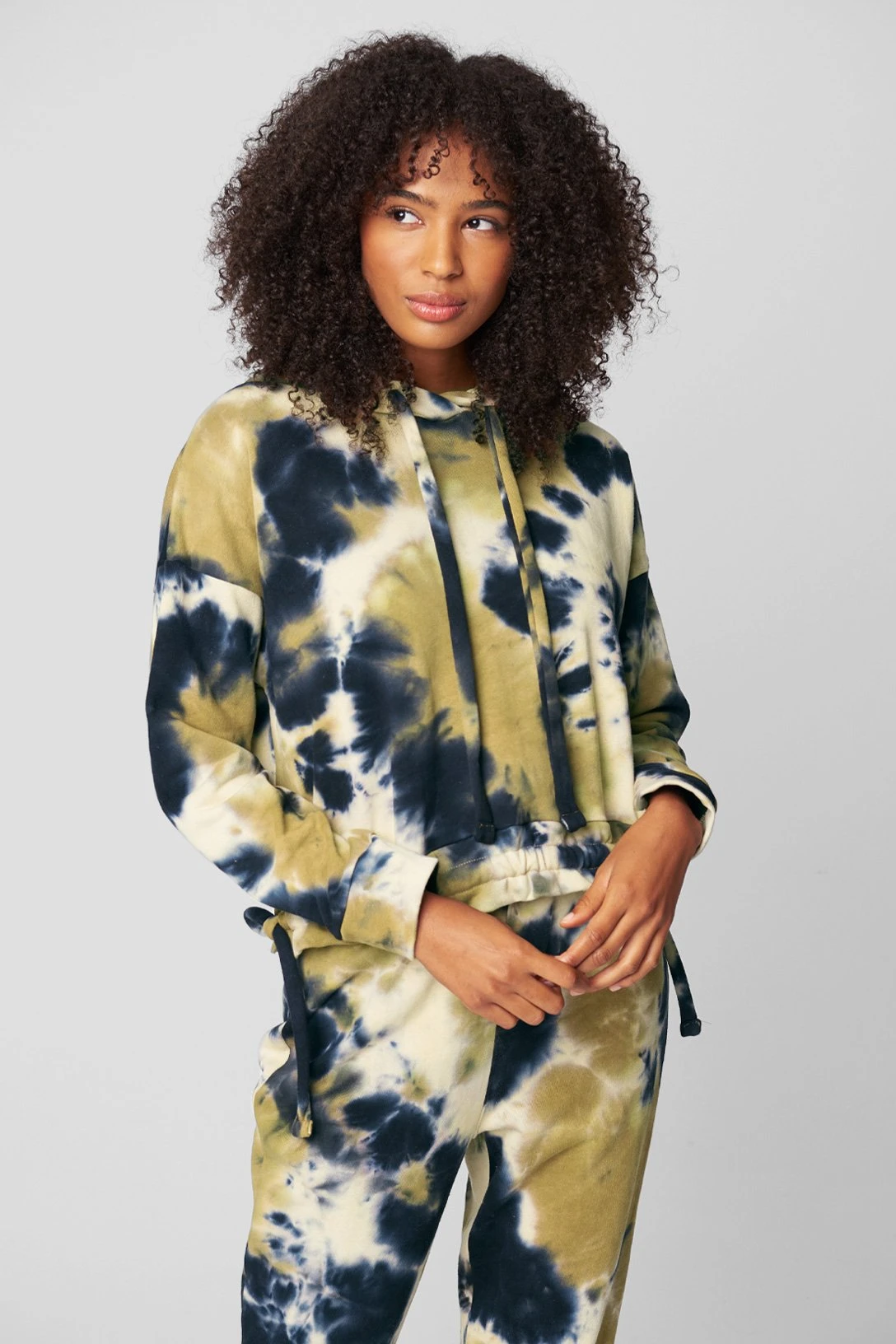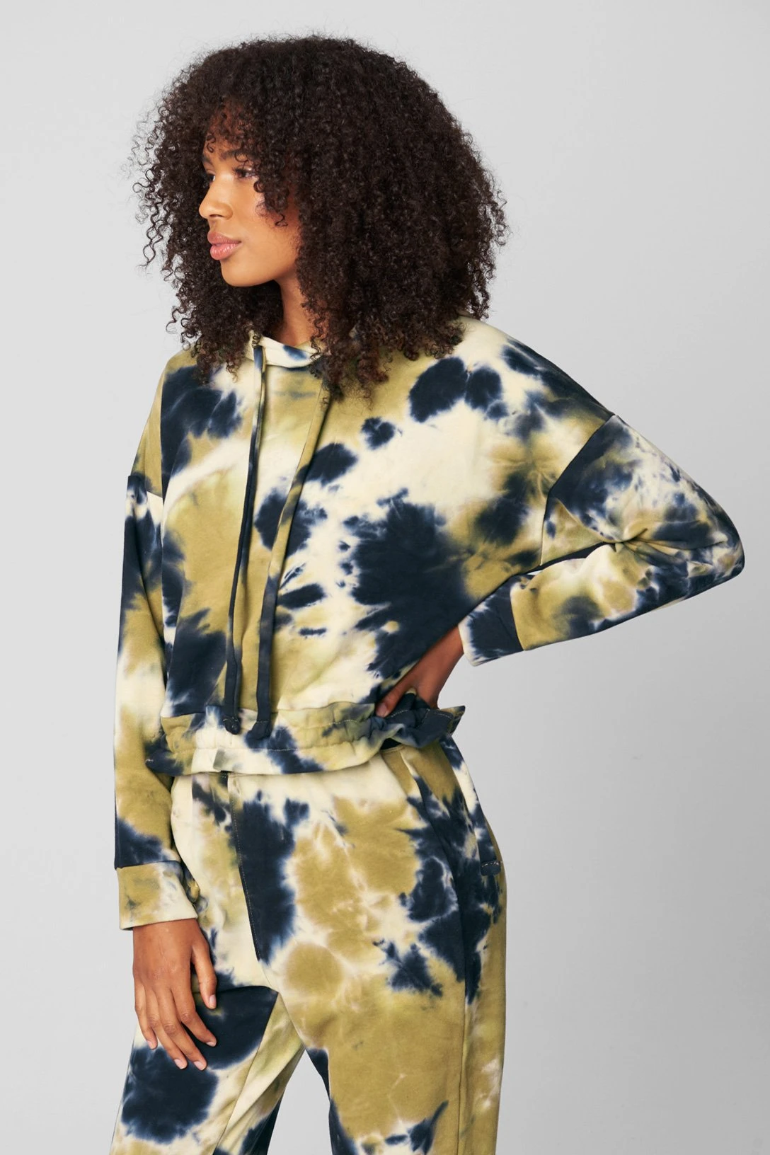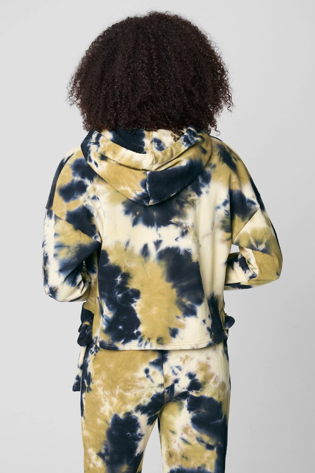 Multicolor tie-dye hooded sweatshirt[95% Cotton, 5% Spandex][MACHINE WASH COLD SEPARATELY,USE GENTLE CYCLE, DO NOT BLEACH, TUMBLE DRY LOW, REMOVE PROMPTLY, LOW IRON IF NEEDED][Model Measurements: Height 5’10”, Bust 32″, Waist 25″, Hips 35 1/2″] [Size on Model: Small]