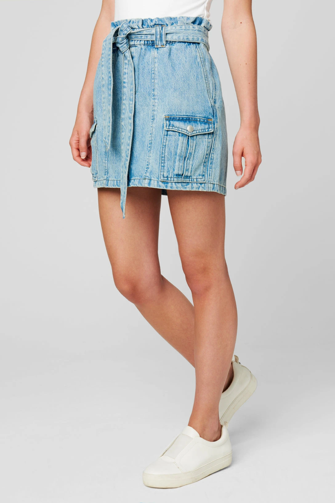 Paperbag Mini Denim Cargo Skirt with Self Belt[100% Cotton][Machine Wash][Size on Model: Small”]