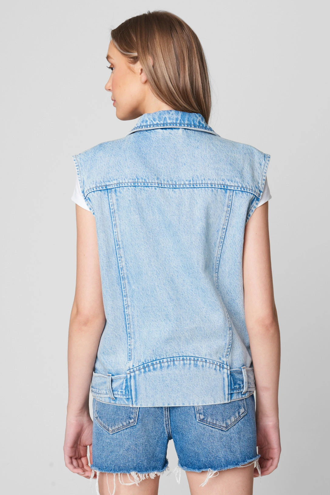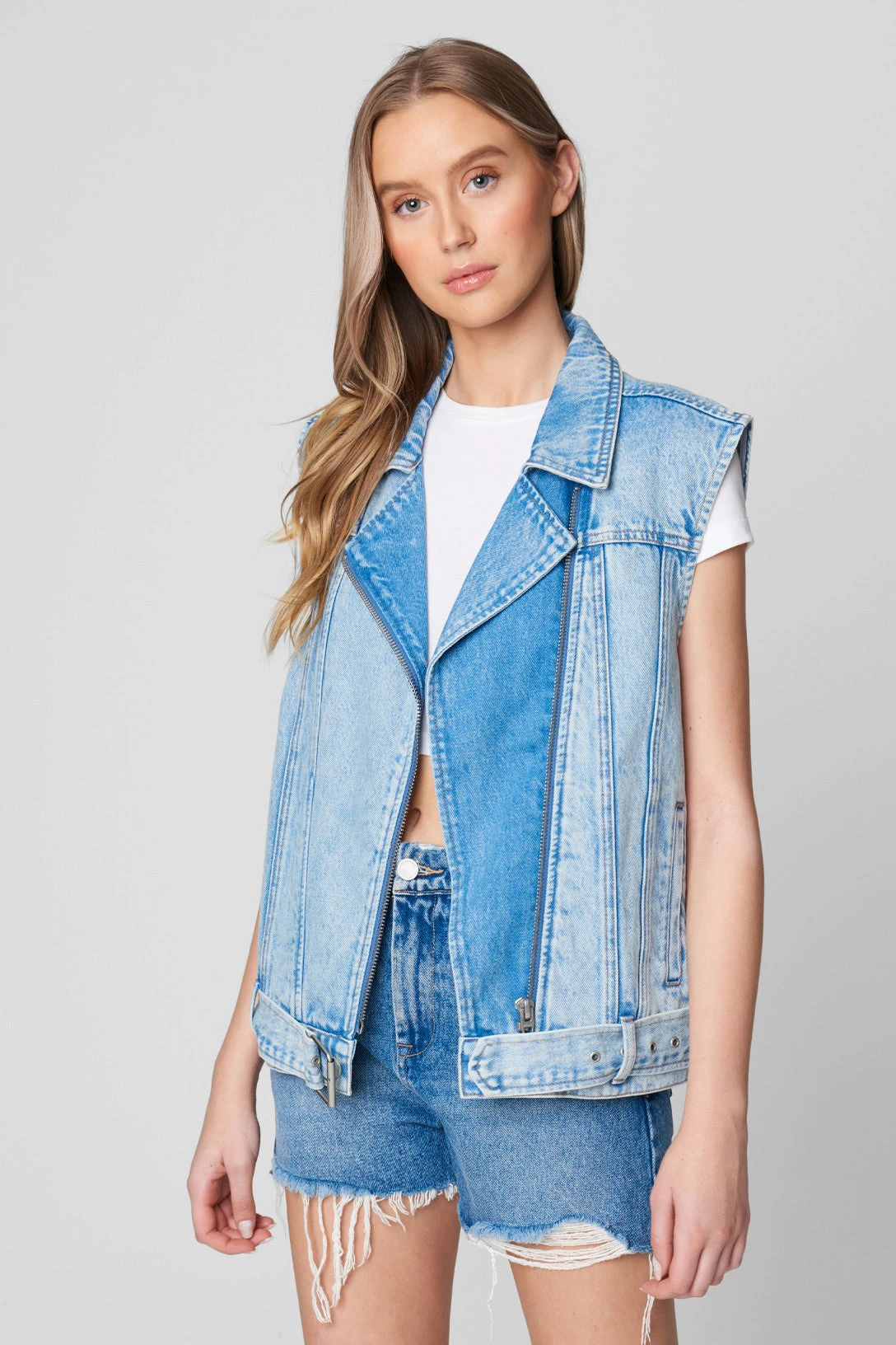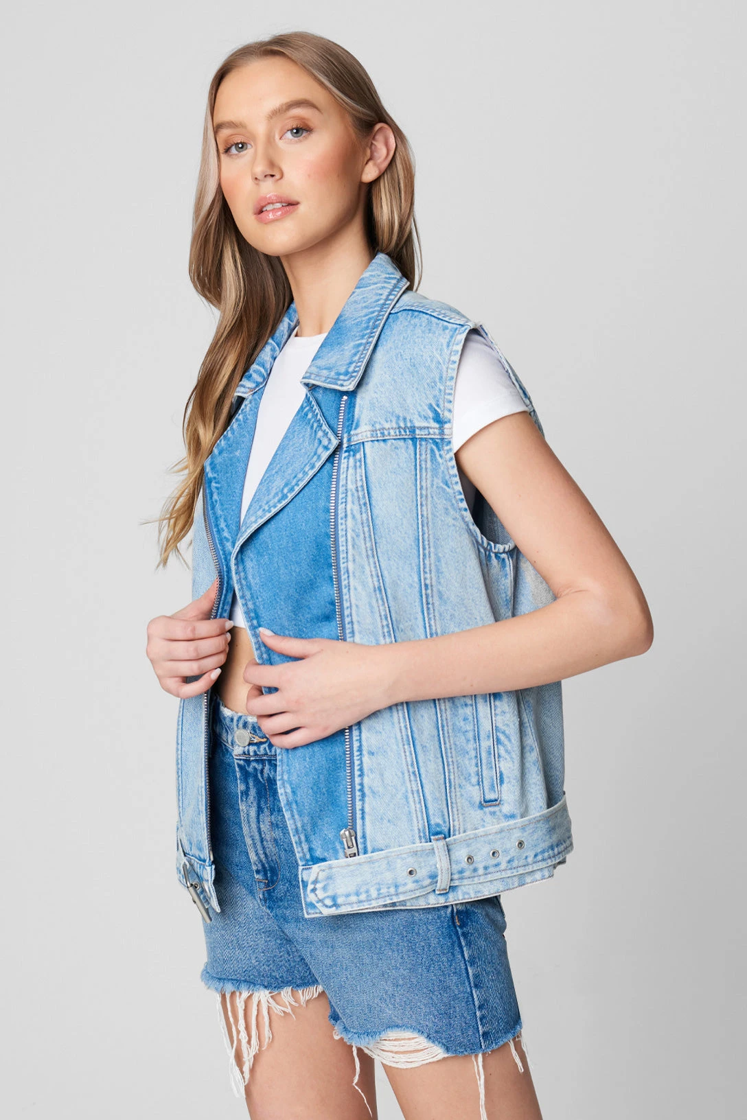 Denim Moto Vest with Self Belt[Shell: 100% Cotton][Turn Garment Inside Out Machine Wash Cold With Like Colors Do Not Bleach Tumble Dry Low Low Iron If Needed][Model Measurements:Height 5’10, Waist 24′][Size on Model: Small]