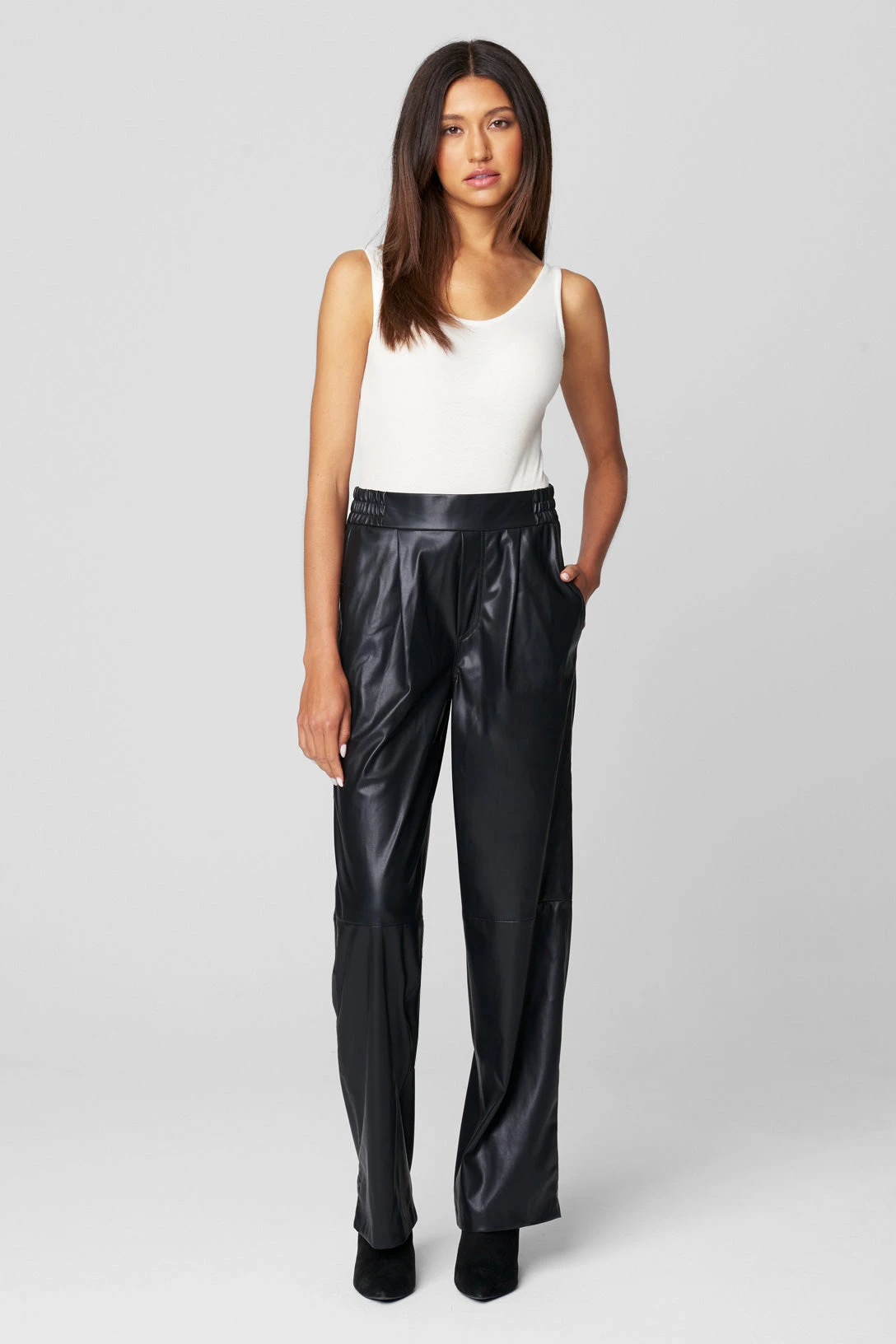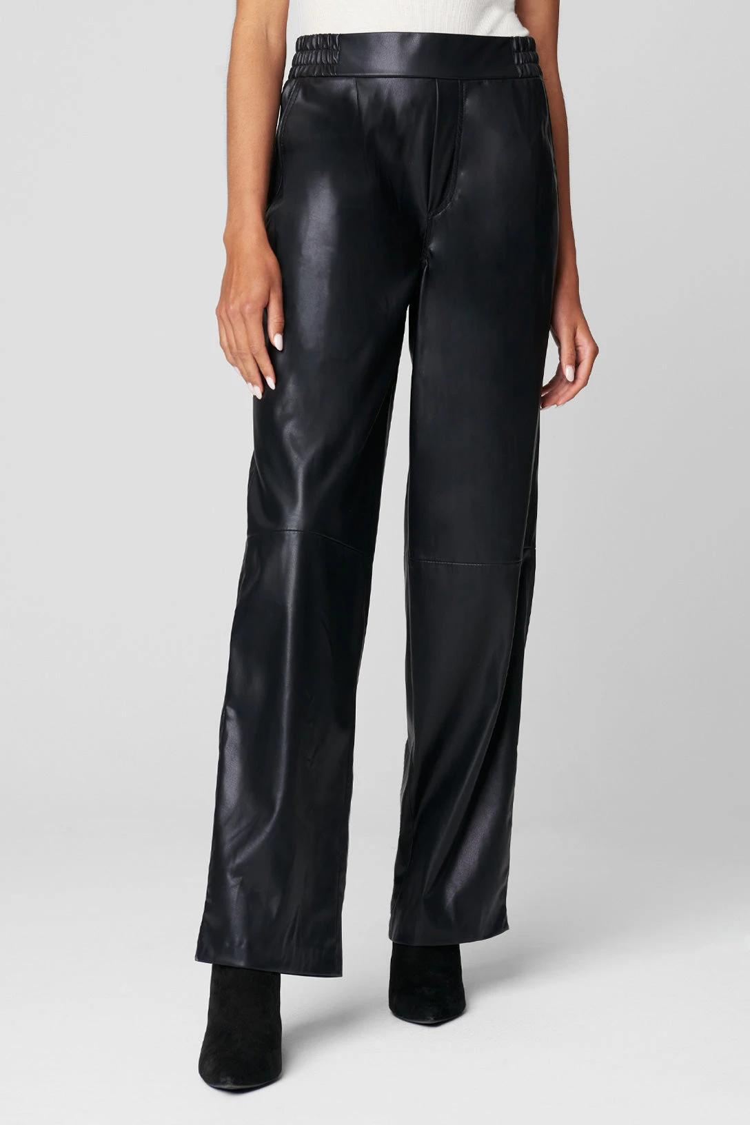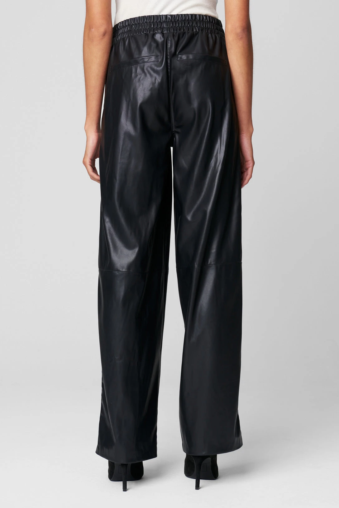 Vegan Leather Elastic Waist Wide Leg Pant[60% Polyurethane, 40% Polyester][Wipe Clean With Damp Cloth, Do Not Machine Wash, Do Not Bleach, Do Not Tumble Dry, Do Not Iron, Do Not Dry Clean][Model Measurements: Height 5’9, Waist 27′][Size on Model: 28”]