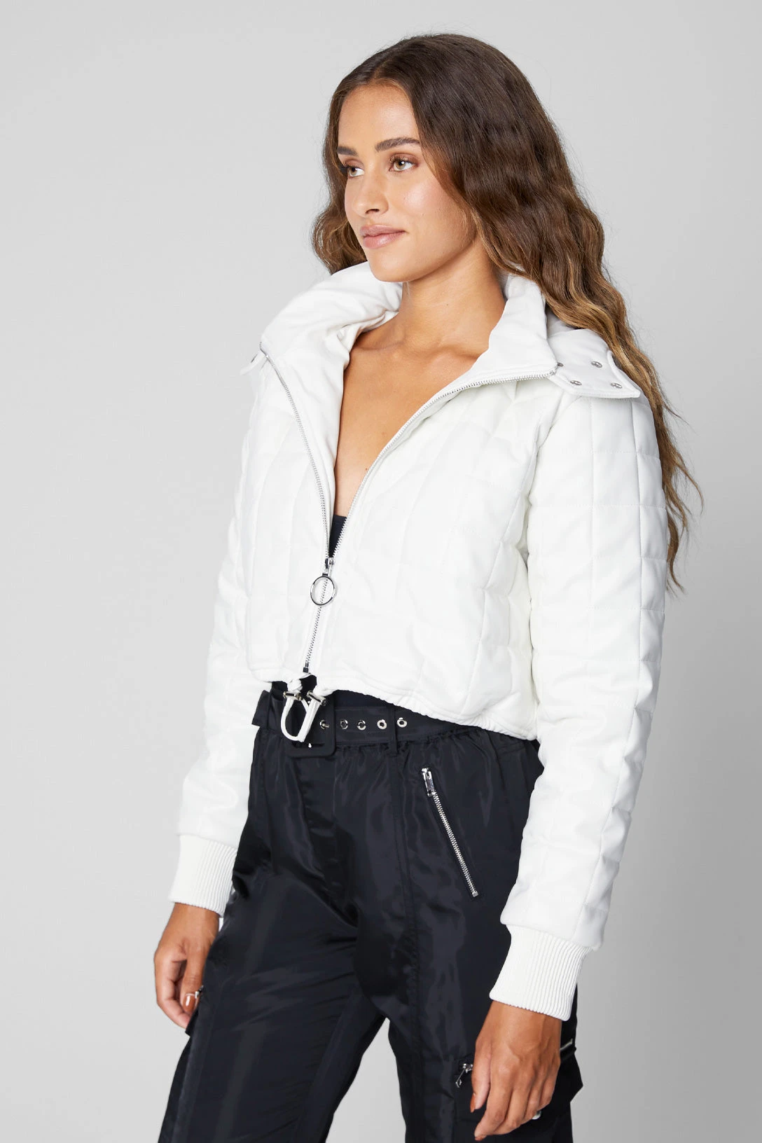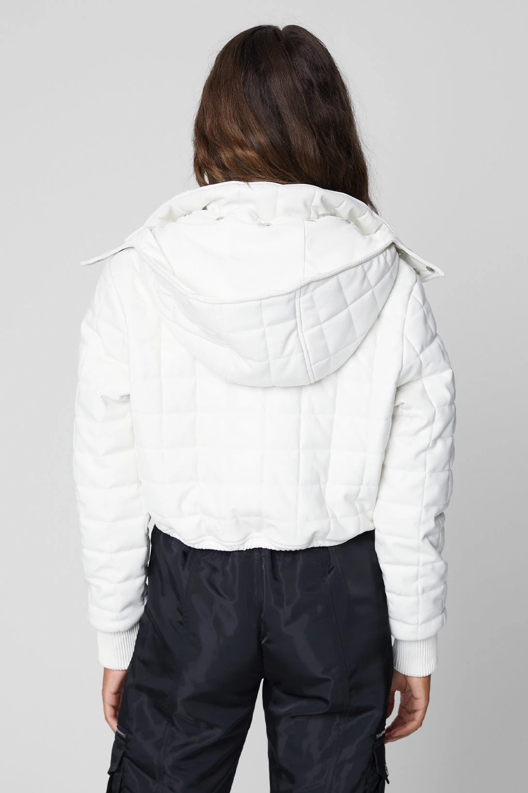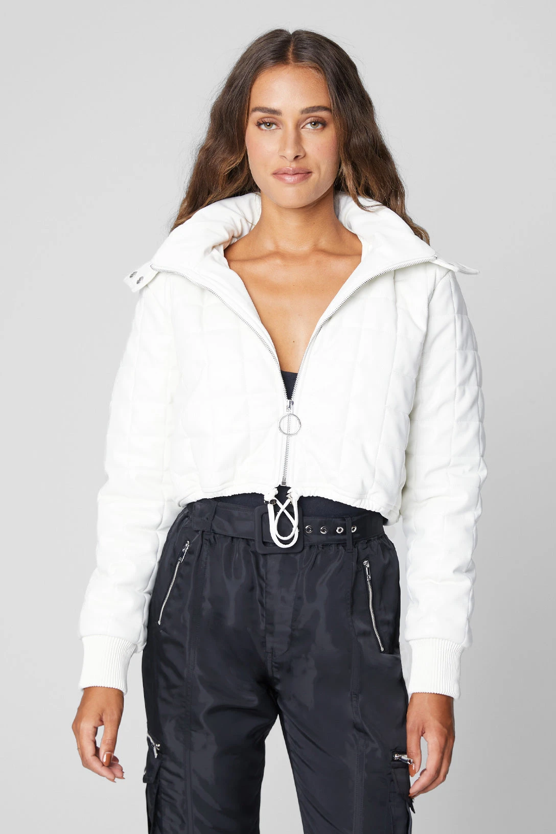 Vegan Leather Cropped Bomber Jacket[Shell: 60% Polyurethane, 40% Viscose – Filling: 100% Polyester – Lining: 97% Polyester, 3% Spandex][Wipe Shell Clean With Damp Cloth, Do Not Machine Wash, Do Not Bleach, Do Not Tumble Dry, Do Not Iron, Do Not Dry Clean][Model Measurements: Height 5’10, Chest 34″, Waist 24″, Hips 35″][Size on Model: Small]