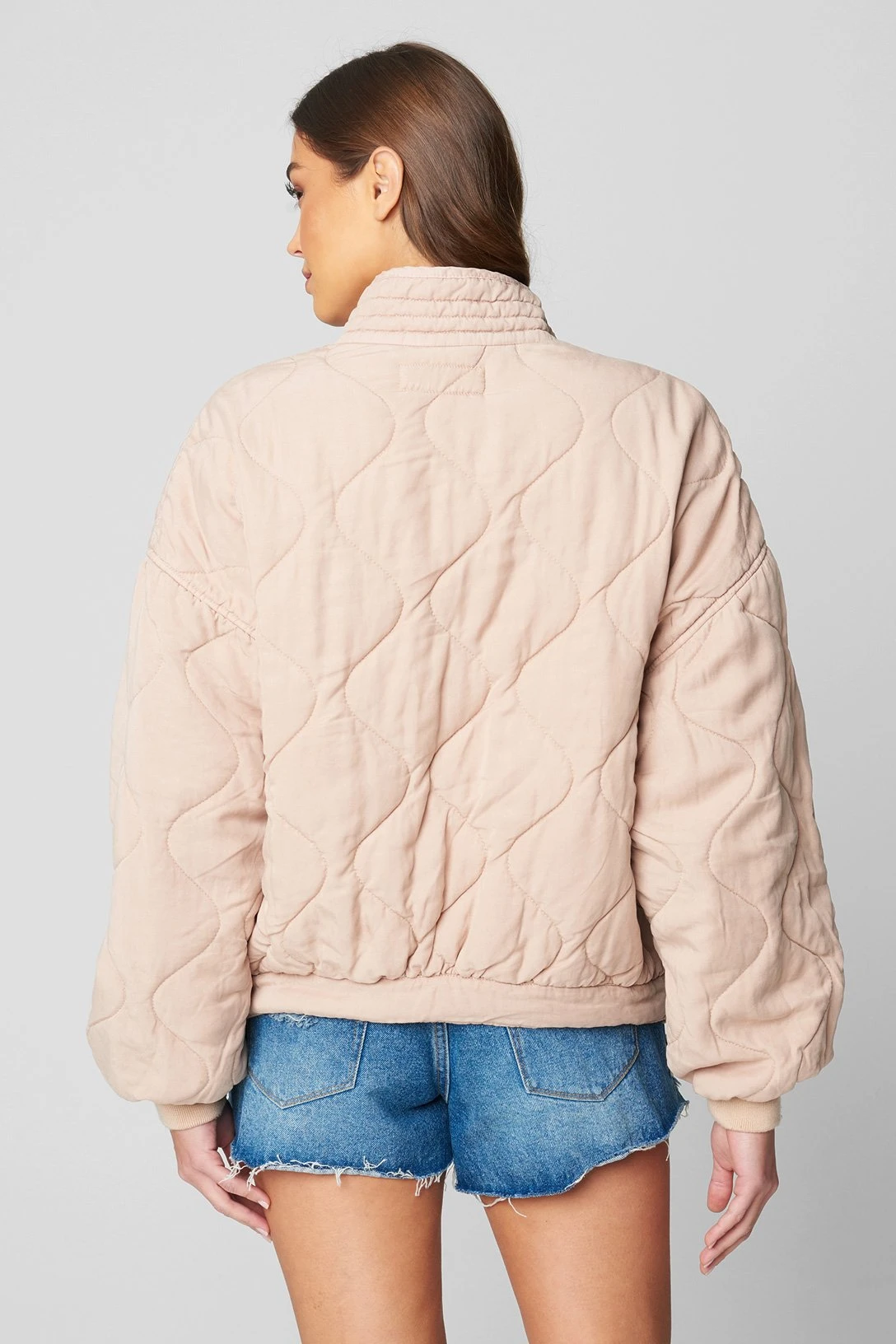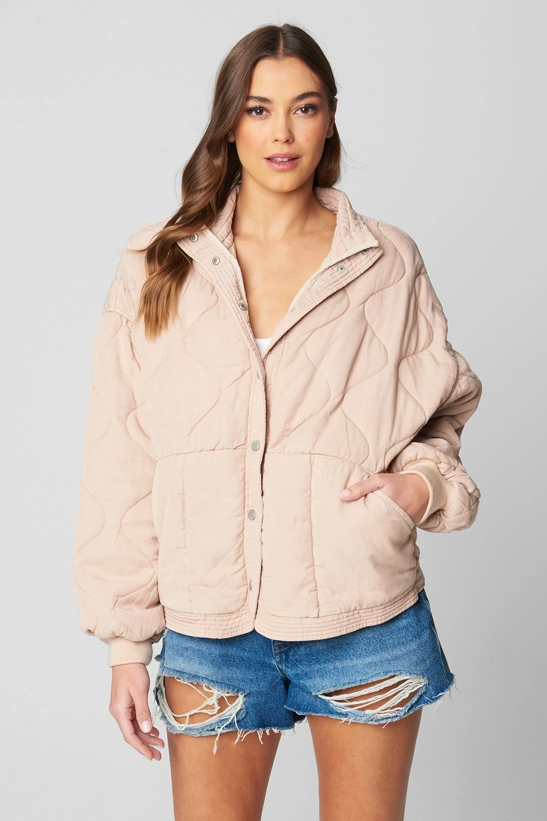 Tan tencel drop shoulder quilted jacket[100% Lyocell, Filling: 100% Polyester, Lining: 100% Cotton][MACHINE WASH COLD WITH LIKE COLORS, USE GENTLE CYCLE, DO NOT BLEACH, TUMBLE DRY LOW, REMOVE PROMPTLY, LOW IRON IF NEEDED][Model Measurements: Height 5’10”, Bust 32″, Waist 24 1/2″, Hips 35″][Size on Model: Small]
