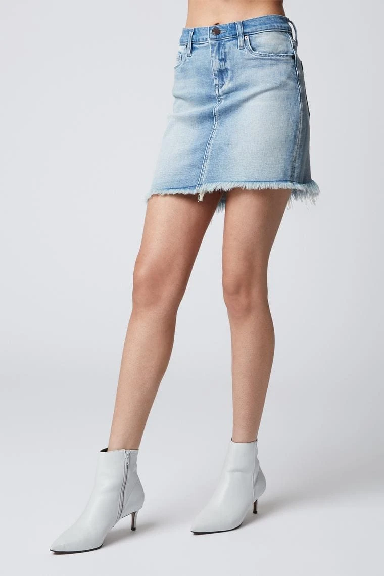 Asymmetrical denim mini with the perfect amount of stretch and finished with a raw hem.