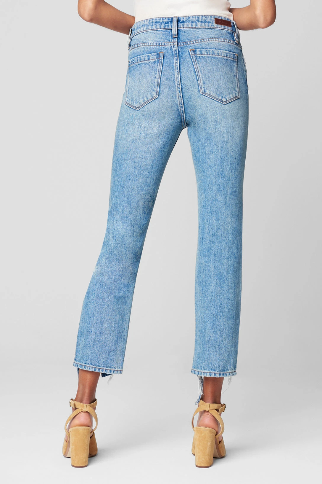 Light Wash High Rise Five Pocket Slim Cropped Straight Leg with Destructed Hem Finish[100% Cotton][Machine Wash Cold With Like Colors, Do Not Bleach, Tumble Dry Low, Low Iron][Model Measurements: Height 5’9, Waist 27′][Size on Model: 28”]