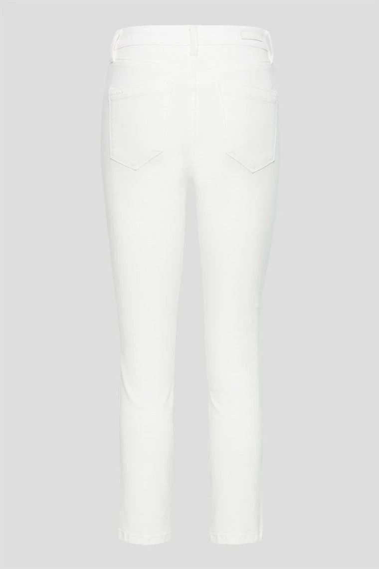 High-rise cropped 5-pocket. Heavily distressed denim in a white wash.