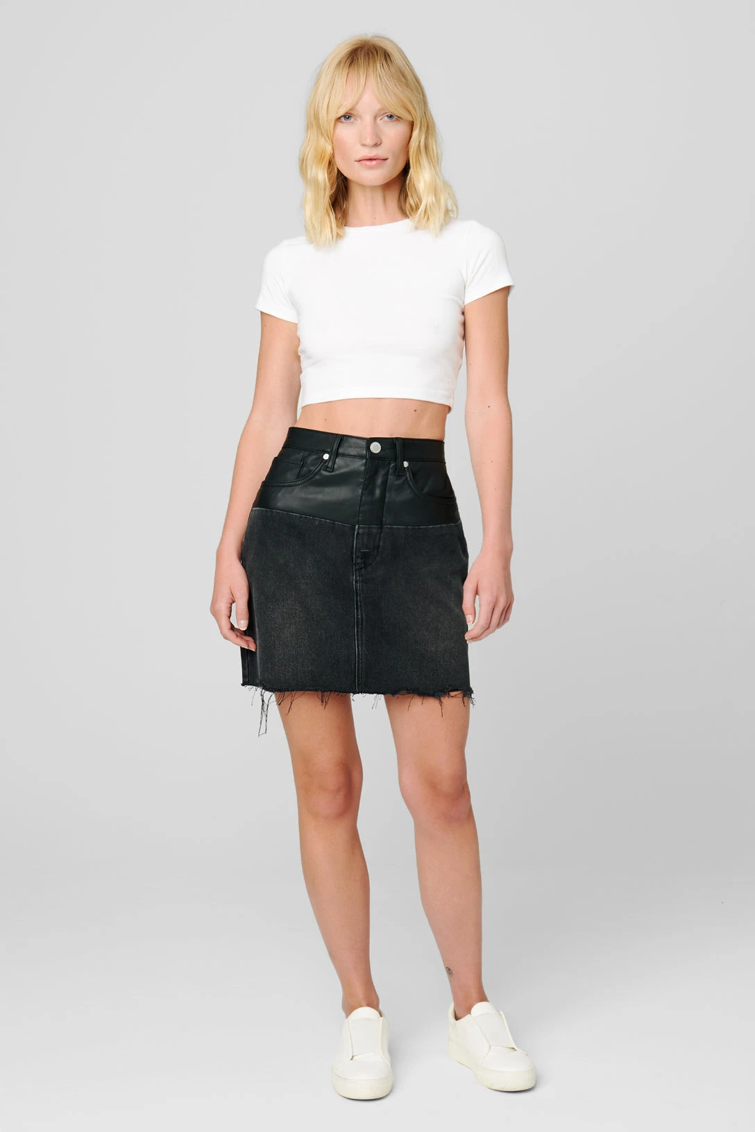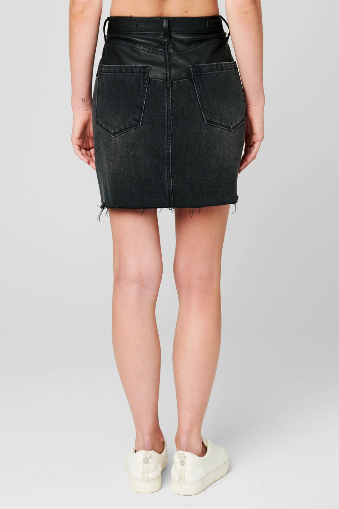 Vegan Leather & Denim High Rise Mini Skirt with Raw Hem Finish[86% Cotton, 14% Polyester][Dry Clean Only][Model Measurements: Height 5’8 | 173 cm, Bust 30B | 76 cm, Waist 24″ | 61 cm, Hips 34′ | 86 cm][Size on Model: 28”]