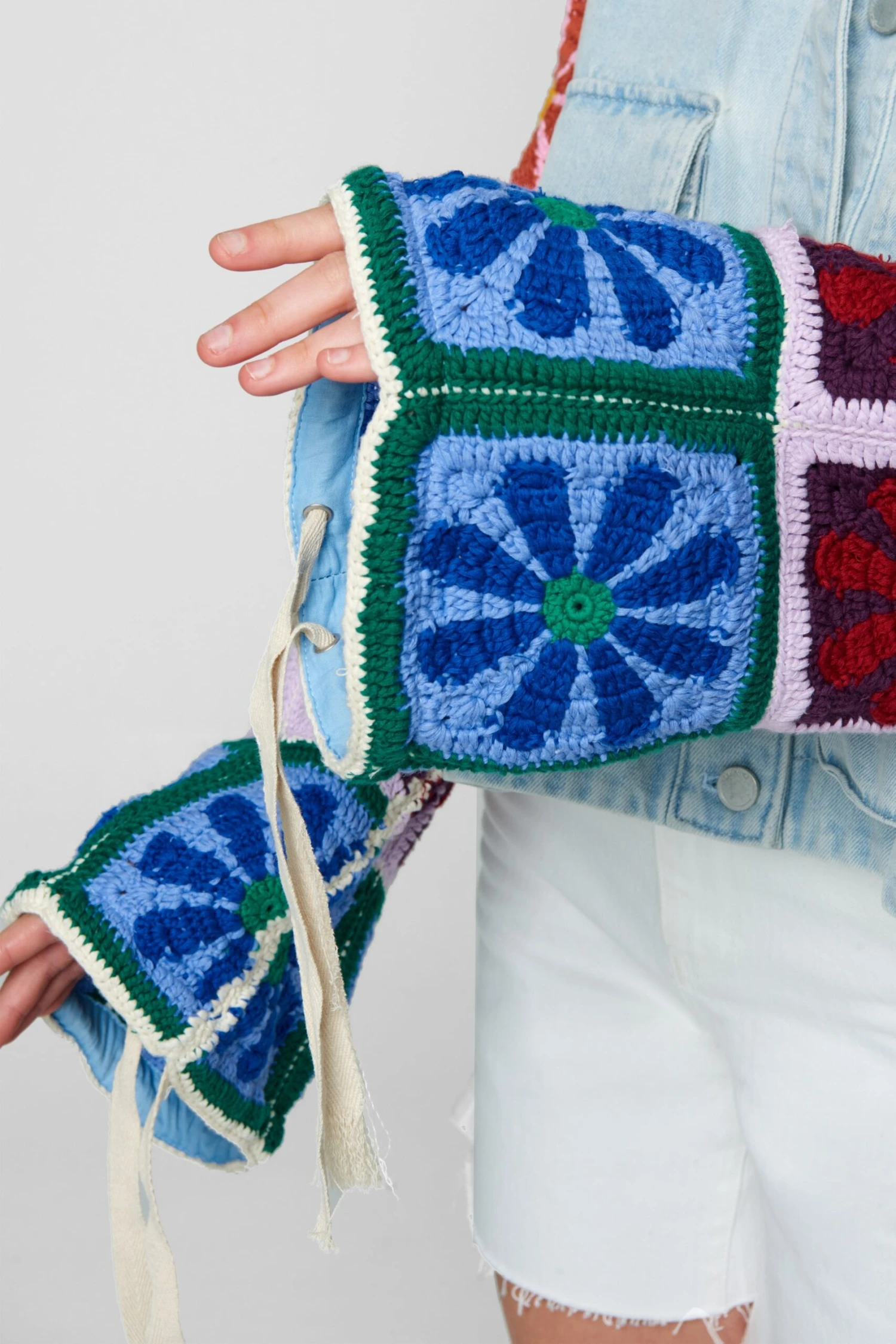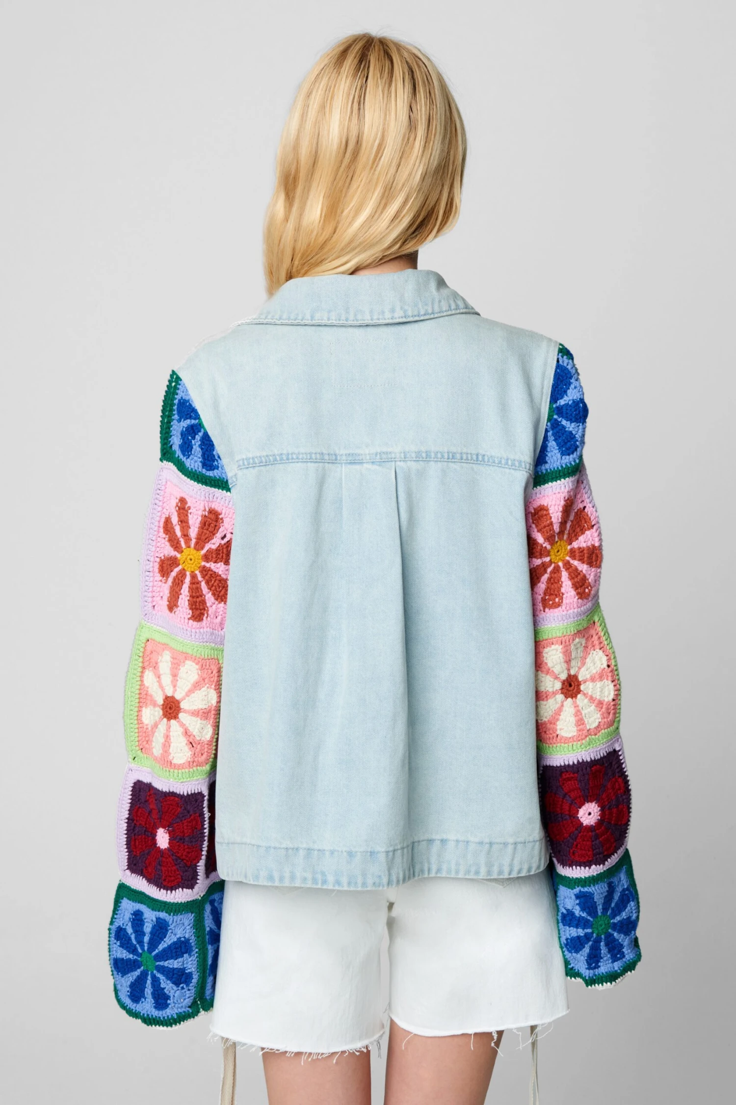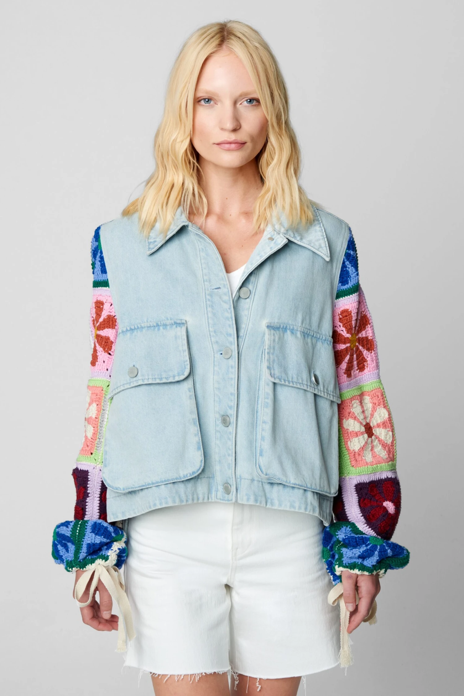 Cropped Denim Shacket with Crochet Bell Sleeves[Shell: 100% Cotton – Trim: 95% Cotton, 5% Spandex][Turn Garment Inside Out – Machine Wash Cold]